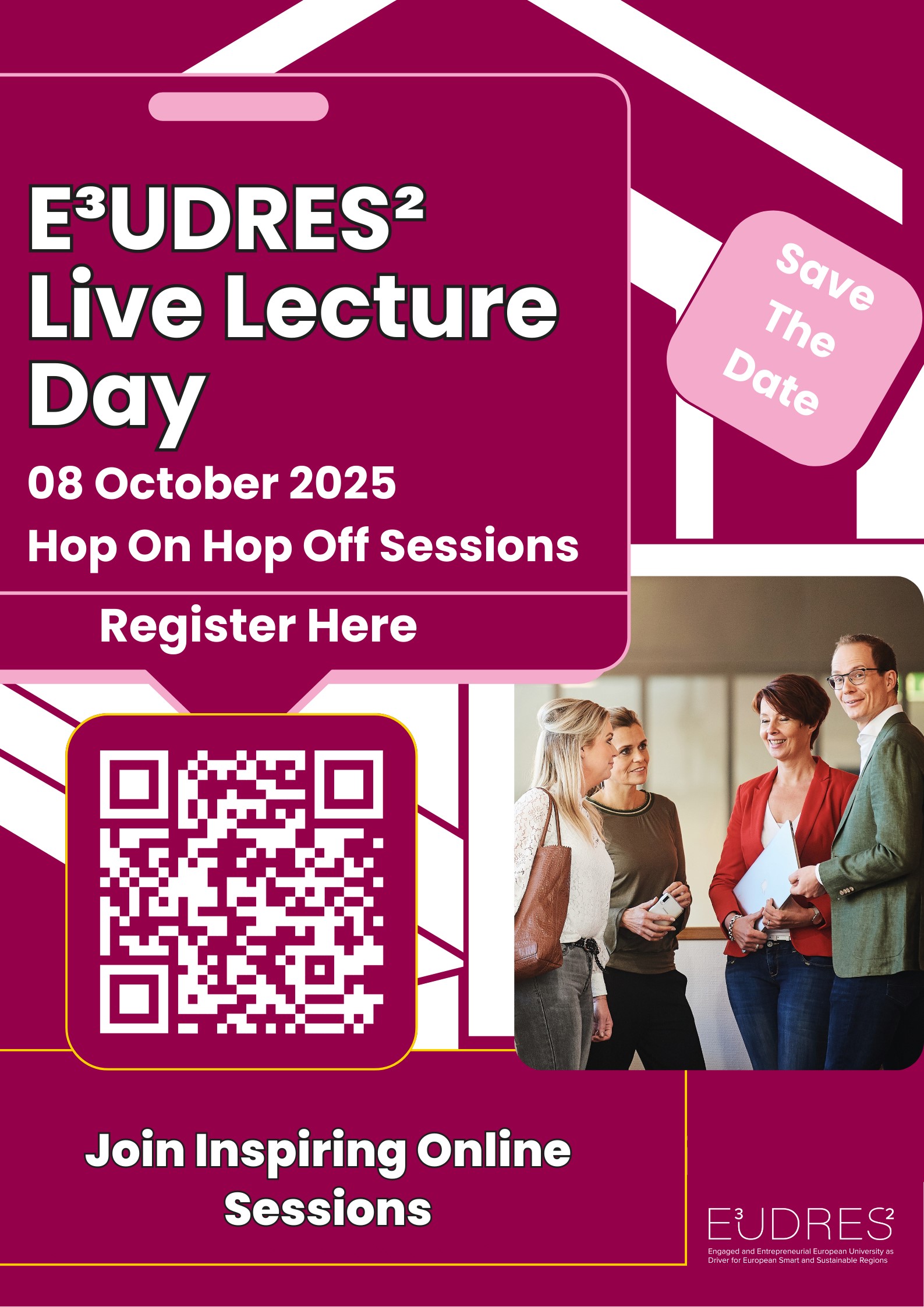 E³UDRES² Live Lecture Day este un eveniment online cu mai multe sesiuni, în care studenți, cercetători, cadre universitare și factori de decizie din întreaga Europă se reunesc pentru a explora idei noi și a contribui la conturarea viitorului regiunilor noastre.
