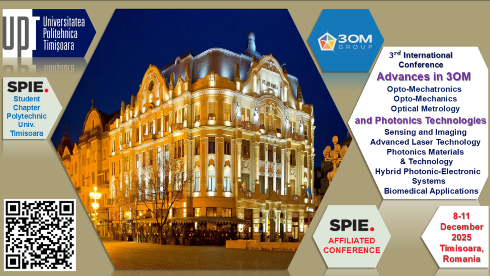 Universitatea Politehnica Timișoara organizează în cadrul Facultății de Electronică, Telecomunicații și Tehnologii Informaționale, în perioada 8-11 decembrie 2025, a 3-a Ediție a Conferinței Internaționale multi-disciplinare “Advances in 3OM and Photonics Technologies”. Conferința este afiliată SPIE (The International Society for Optics and Photonics, https://spie.org/). Lucrările vor fi publicate In Proceedings of SPIE (indexate ISI Web of Science pentru primele două ediții, 3OM 2021 și 3OM 2023). Detalii despre primele două ediții se găsesc în Book of Abstracts 2021 și 2023.